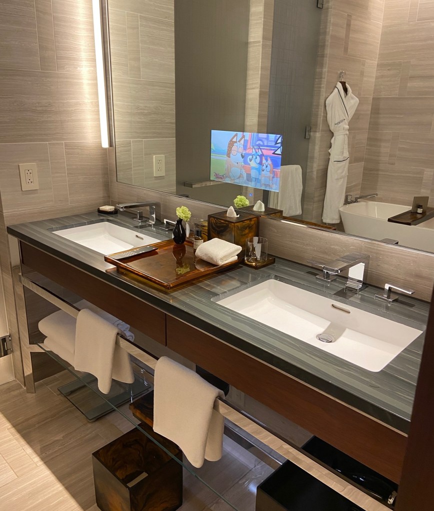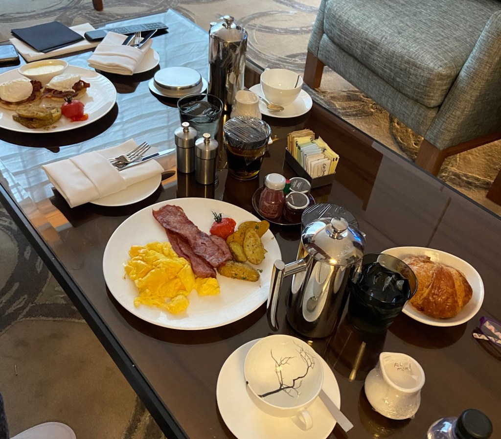 As a Globalist, we were able to enjoy complementary breakfast each day. They allowed us to either dine in the restaurant or use room service. For us, we made use of the latter. Both mornings we ordered whatever we wanted, from eggs and bacon to pancakes, large pots of coffee, and muffins. Each day, the entire bill was wiped out! One of the many benefits of having top tier status.