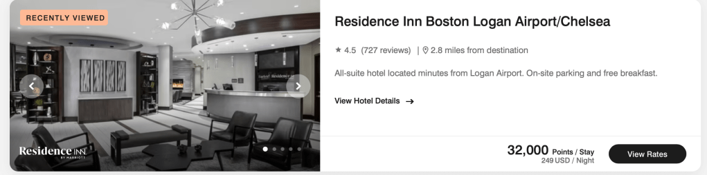 The Residence Inn Boston Logan Airport/Chelsea offers rooms starting at 32,000. Using your points, you could get a room that would have cost you upwards of $249! Not every hotel will be an option, but in general you can expect to get about $200 in value from your certificate. As an added bonus, Marriott allows you to add up to 15,000 points to your certificate, giving you 50,000 points to utilize.